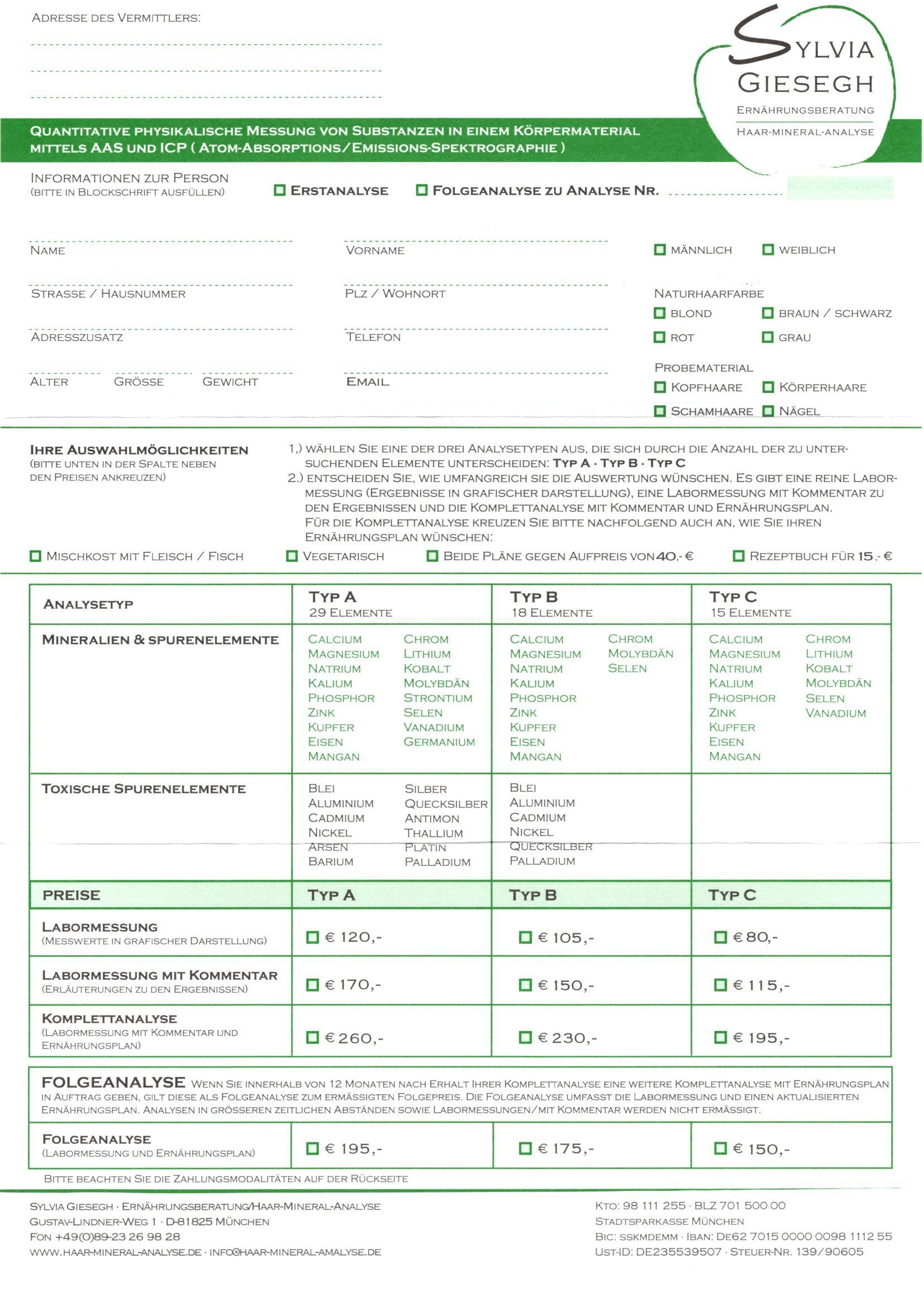 Wie viele andere etablierte naturheilkundliche Ansätze auch, beruht meine Methode - basierend auf der Haar-Mineral-Analyse - auf Erfahrung und ist nicht wissenschaftlich anerkannt. Die Umsetzung der Empfehlungen erfolgt auf eigene Gefahr, eine Haftung für eventuelle aus der Umstellung resultierende Nachteile ist ausgeschlossen. Meine Beratung in Ernährungsfragen ersetzt nicht die medizinische Behandlung Ihrer Erkrankung durch einen Arzt und ersetzt keine Therapie oder Medikation.